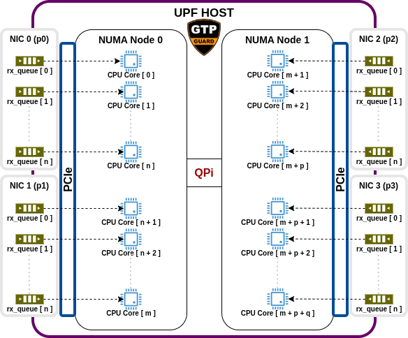 NUMA node, attached to the local PCIe bus. Each port exposes multiple rx_queues;
