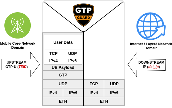 Mobile Core-Network is encapsulating all UE traffic into GTP until UPF where traffic is decapsulated and routed to reach the destination network. Each UE session is identified by a TEID (Tunnel Endpoint Identifier) — a 32-bit value carried in every GTP-U packet header.