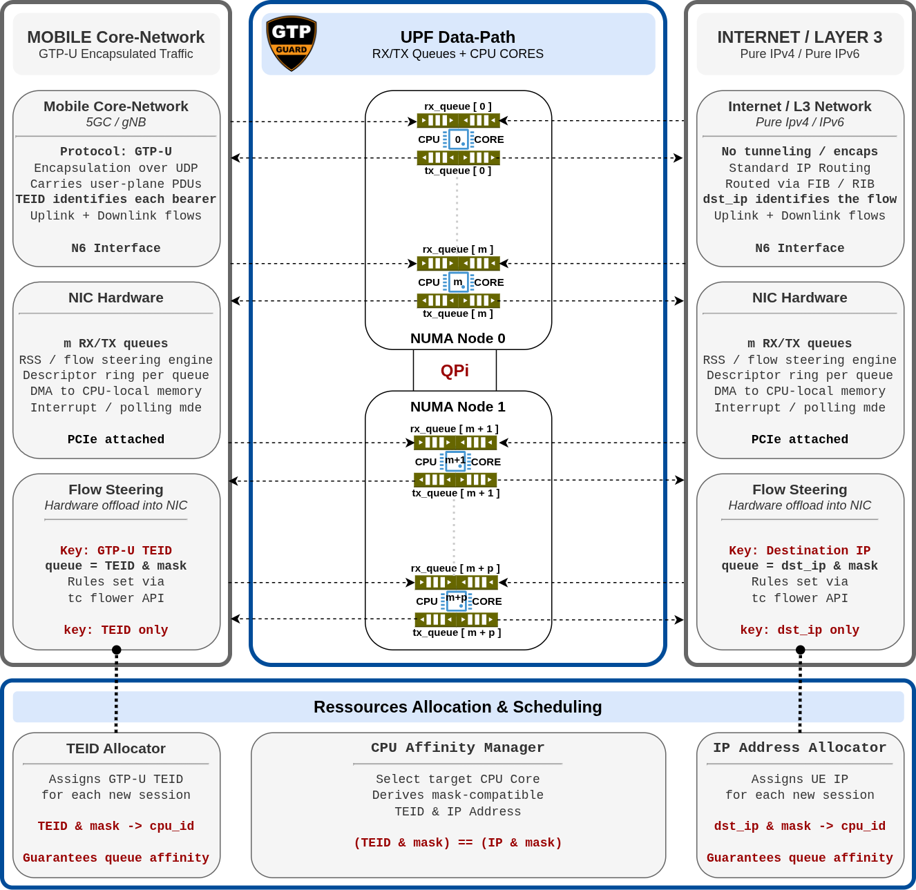 Modern mobile user-plane deployments (5G UPF, gNB CU-UP) push large volumes of GTP-U encapsulated traffic through commodity servers fitted with high-speed NICs. Our goal was to leverage NIC hardware capabilities to reduce complexity while improving overall performance. Many designs exist, but not all handle large traffic volumes well. Our target is to achieve around 800 Gbps on a 1RU commodity server. The UPF is a key routing element in this context: it acts as a border relay between the mobile core network and a Layer 3 network (Internet or any private network). The main UPF protocol stack looks like: