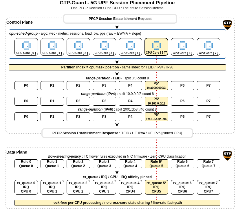 But TC flower rules are static, manually installed, and disconnected from the session lifecycle. This article takes the next step by integrating range partitioning into the UPF control plane so that every PFCP session establishment becomes a scheduling decision the NIC enforces at line rate. It introduces GTP-Guard's configuration framework that bridges hardware flow steering and PFCP session management, and provides concrete configuration examples for realistic mobile network deployments.